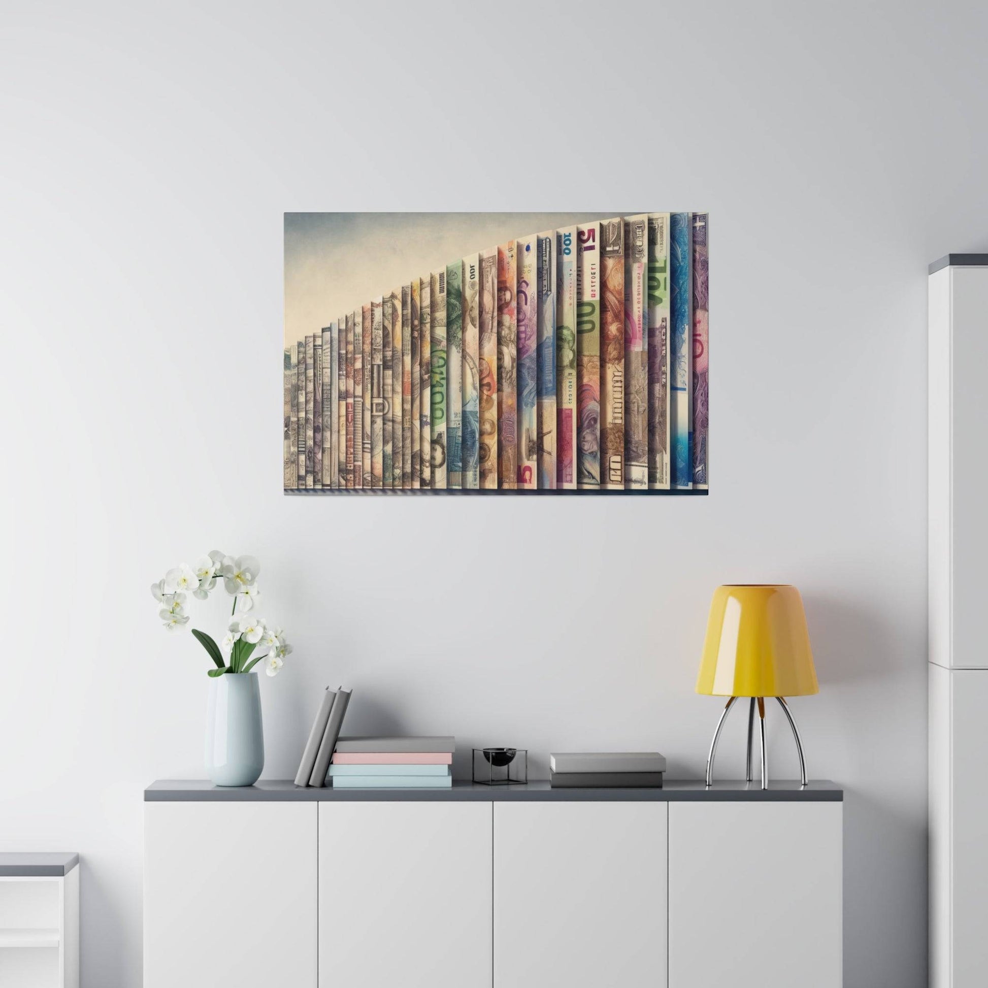 Celebrate the essence of prosperity with our "Abundance Manifested: Money-Themed Canvas Art." This elegant artwork features an artistic display of various currencies, creatively arranged to symbolize wealth and financial success. The detailed rendering against a rich, dark background enhances the visual impact, making it a compelling addition to any space that values ambition and success.